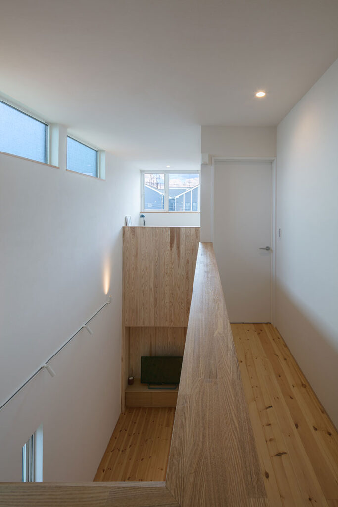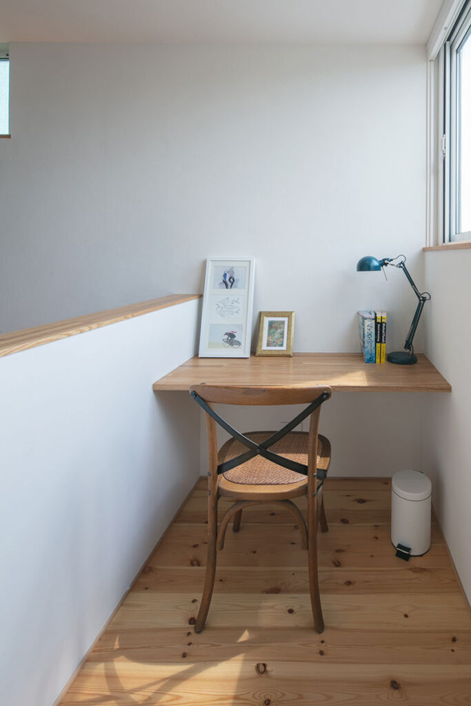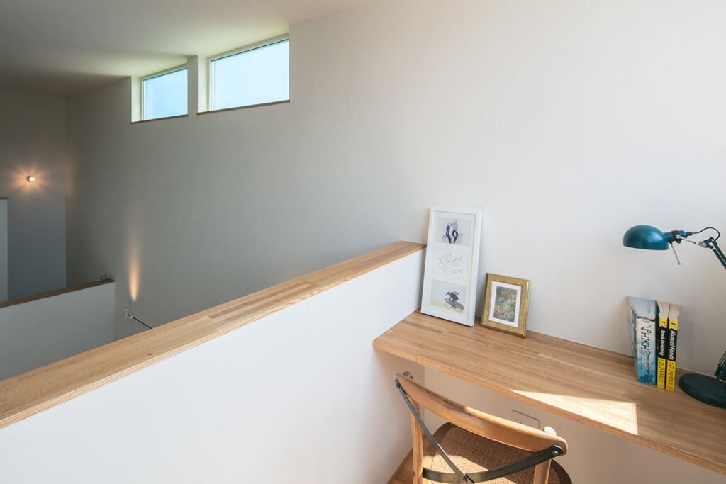 家の中心に吹き抜けを設け、自然光と風をたっぷりと取り込みながら、縦方向への広がりを意識した設計で、実際の床面積(延床面積30.55坪)以上の広がりを感じさせます。